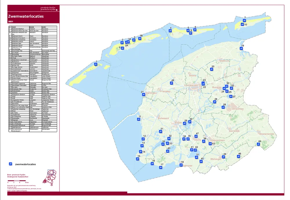 Dit jaar zijn er in Fryslân 53 officiële zwemwaterlocaties. Ten opzichte van het jaar ervoor is er één zwemlocatie bijgekomen.